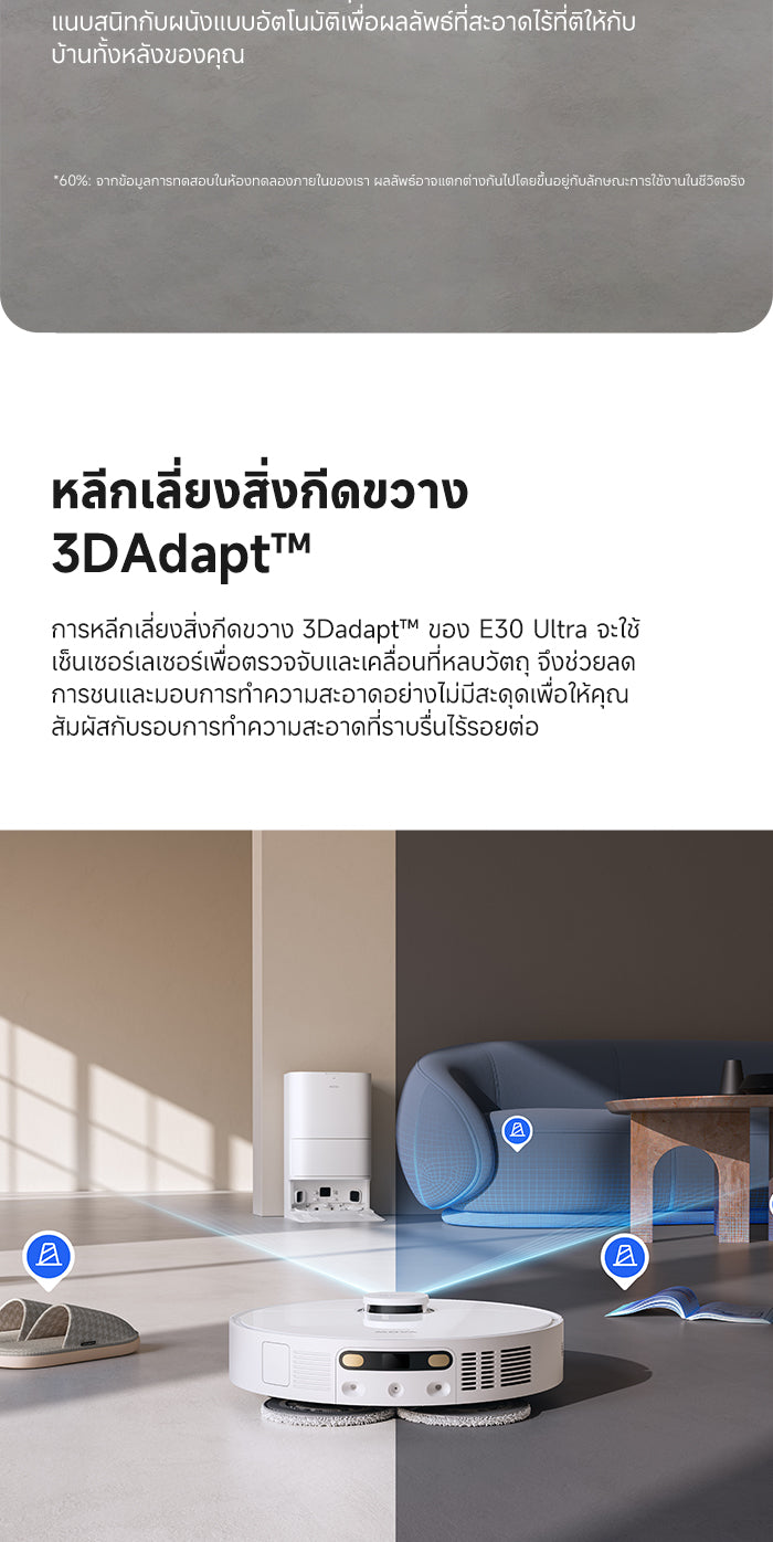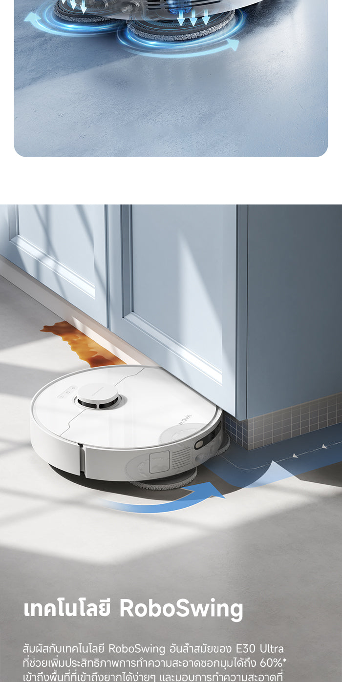 1.การทำความสะอาดขอบอัตโนมัติ:E30 Ultra ออกแบบด้วยการสวิงกลับเพื่อจัดการฝุ่นในมุมและขอบฐาน เพิ่มประสิทธิภาพการทำความสะอาดมุมขึ้น 25% สนุกกับการทำความสะอาดแบบอัตโนมัติทั่วถึงทุกซอกทุกมุมในบ้านของคุณ