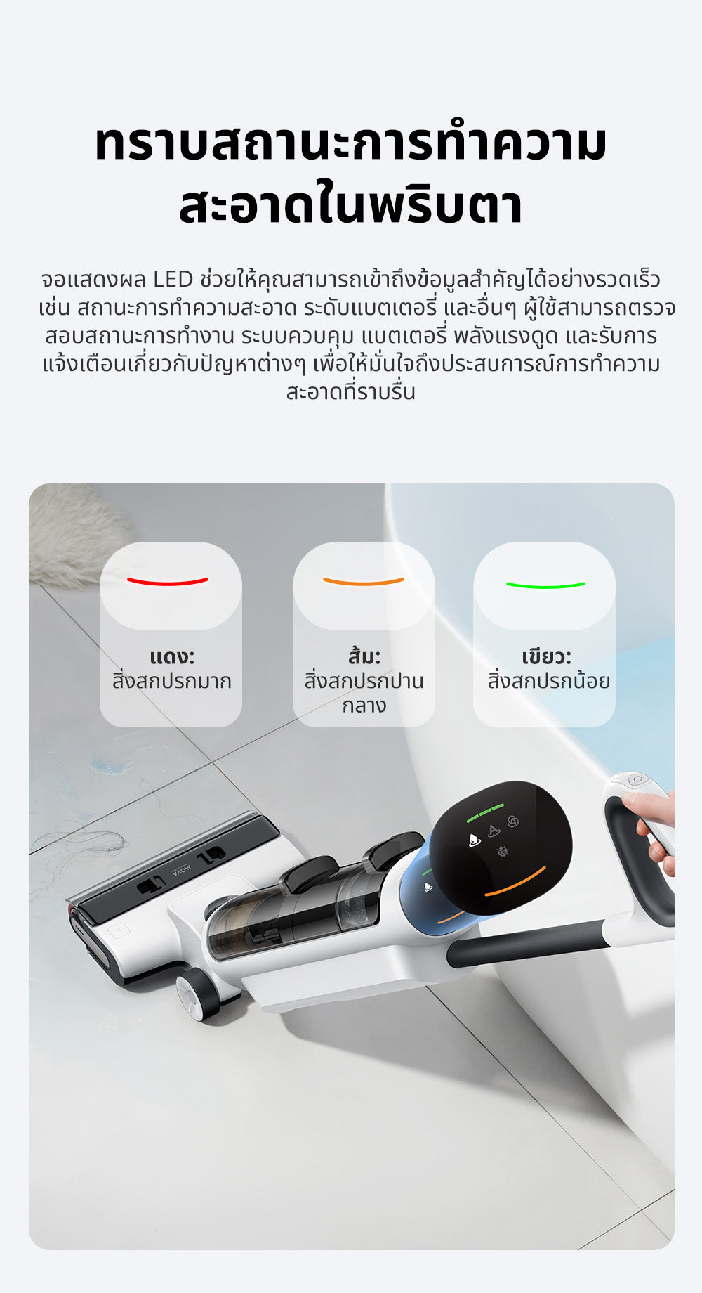หน้าจอ LED ที่แสดงสถานะการทำความสะอาด ระดับแบตเตอรี่ และข้อมูลสำคัญอื่น ๆ แบบเรียลไทม์ ช่วยให้คุณสามารถติดตามสถานะการทำงานของอุปกรณ์ จัดการการตั้งค่าการทำความสะอาด ตรวจสอบระดับแบตเตอรี่ ปรับแรงดูด และรับการแจ้งเตือนเกี่ยวกับข้อผิดพลาดของอุปกรณ์ ได้อย่างง่ายดาย