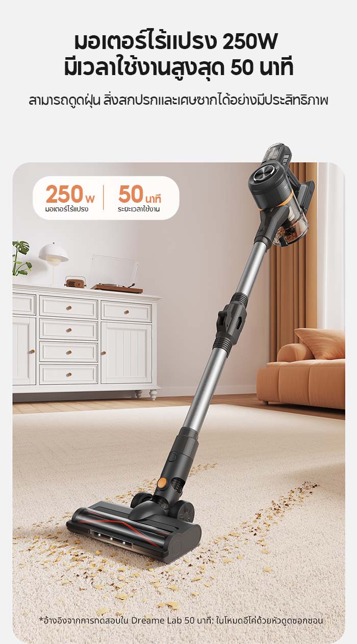 มาพร้อมมอเตอร์ไร้แปรงถ่าน 250W ที่สามารถใช้งานได้นานถึง 50 นาที ในการทำความสะอาดฝุ่น สิ่งสกปรก และเศษขยะได้อย่างมีประสิทธิภาพ