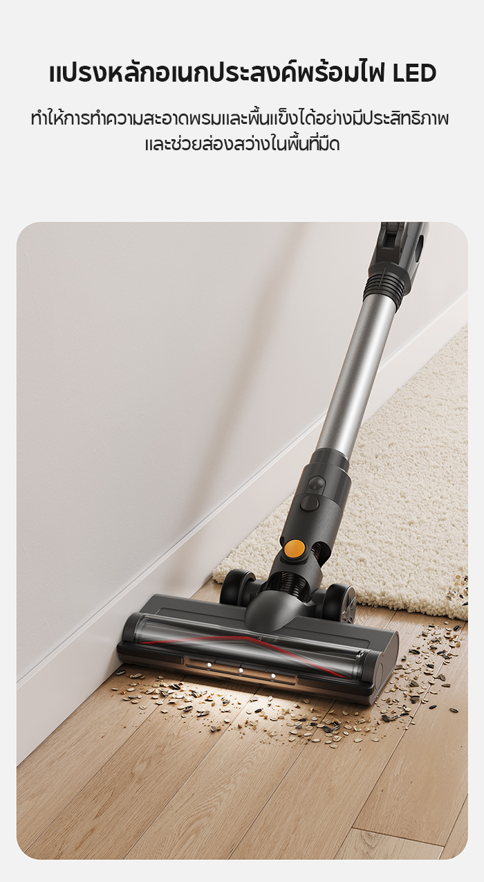 📌 หัวแปรงพร้อมไฟ LEDให้แสงสว่างแม้ในมุมที่มืดที่สุด เพื่อช่วยค้นหาฝุ่นที่ซ่อนอยู่บนพื้นแข็ง เพิ่มการทำความสะอาดที่ลึกและทั่วถึง